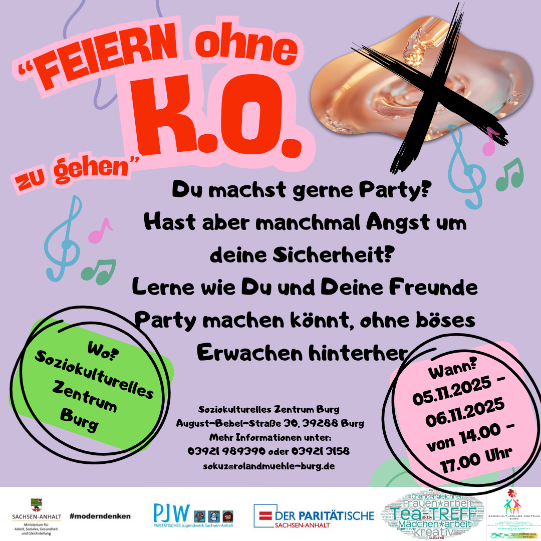 Dann komm am 5.11. und 6.11.2025 von 14:00 bis 17:00Uhr zu unserem Workshop “ Feiern ohne K.O. zu gehen“ für Mädchen und junge Frauen bis 27 Jahre. Lerne wie Du und Deine Freunde Party machen könnt, ohne böses Erwachen hinterher.