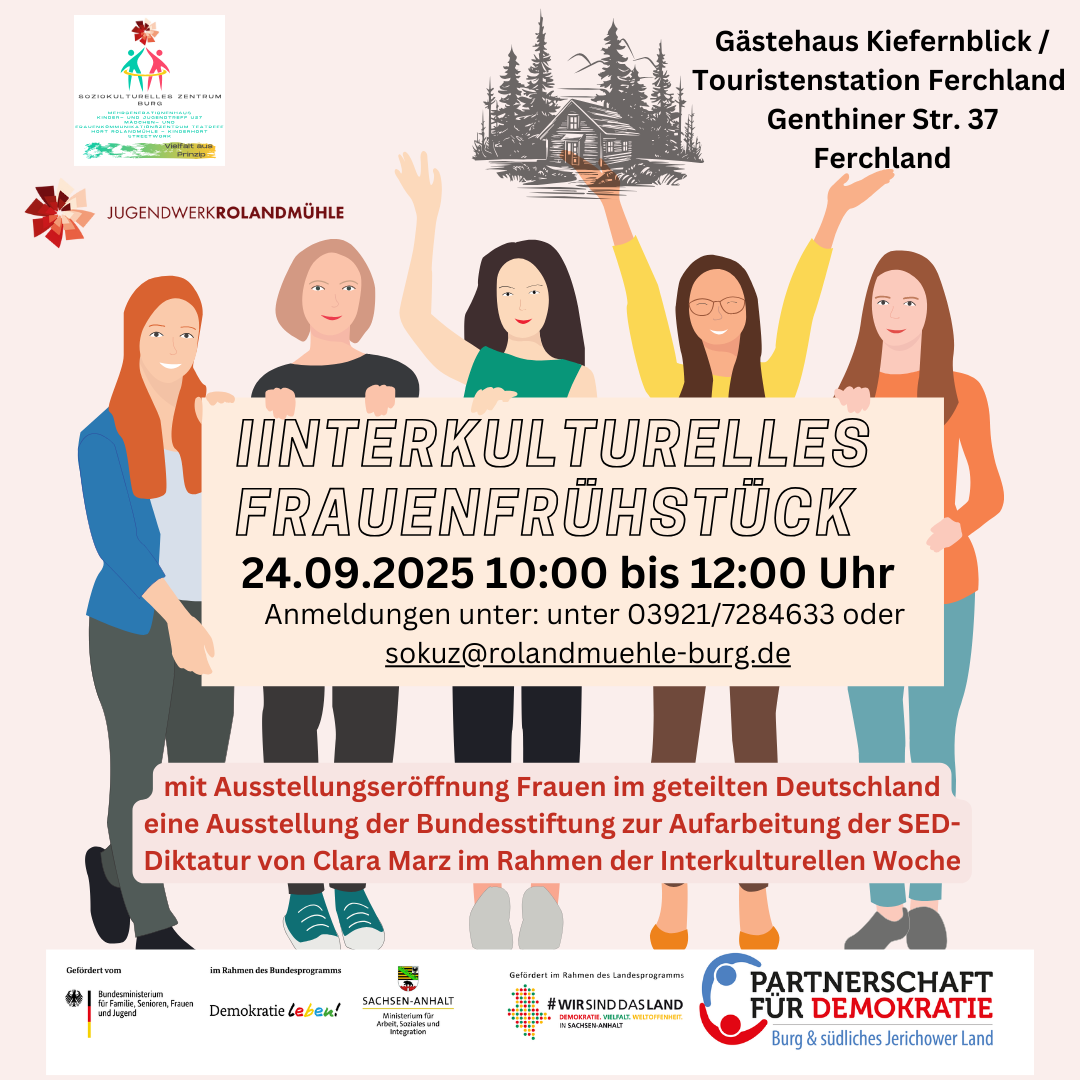 Gemeinsam genießen, austauschen, lachen und Vorurteile abbauen. Im Rahmen der Interkulturellen Woche 2025 lädt das Mädchen- und Frauenkommunikationszentrum Tea-TREFF Burg in Kooperation mit dem MehrGenerationenHaus Burg, mit Unterstützung von „Demokratie leben!“ – Partnerschaft für Demokratie Burg und südliches Jerichower Land, zum „INTERKULTURELLES FRAUENFRÜHSTÜCK MIT WALDBLICK“ ein. Am 24. September 2025 um 10:00 Uhr startet das Frauenfrühstück in der Touristenstation Ferchland. Dabei kommen Frauen* aus unterschiedlichen Kulturen an einen Tisch und gemeinsam ins Gespräch und Stadtgrenzen überschritten.