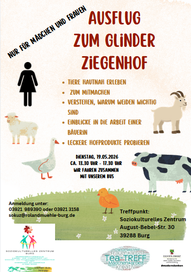 Soziokulturelles Zentrum Burg August-Bebel-Straße 30, BurgDein Treffpunkt für dich und deine Mädels – ein Ort zum Kreativsein, Austauschen und Wohlfühlen. Gemeinsam könnt ihr basteln, malen oder Neues ausprobieren und dabei über Themen sprechen, die euch beschäftigen und wichtig sind. In geschützter Atmosphäre ist Platz für Gespräche, Spaß, Vertrauen und gegenseitige Unterstützung – ganz unter Mädchen.…