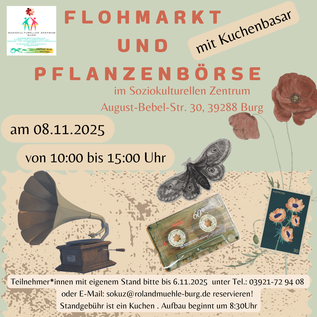 Soziokulturelles Zentrum Burg August-Bebel-Straße 30, BurgStandgebühr: Ein Kuchen für den Kuchenbasar Anmeldung: bis zum 01. Oktober unter unten stehenden Kontaktdaten Wichtige Hinweise Aufbau der Flohmarktstände ist ab 8.00 Uhr möglich Standgebühr ist ein Kuchen für den Kuchenbasar, ein Päckchen Kaffee oder fünf Päckchen Milch Auf- und Abbau des Standes ist in Eigenverantwortung zu übernehmen Tische,…