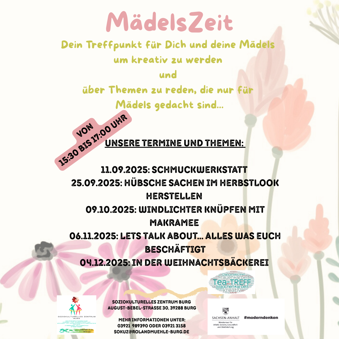 Soziokulturelles Zentrum Burg August-Bebel-Straße 30, BurgDein Treffpunkt für Dich und deine Mädels um kreativ zu werden und über Themen zu reden, die nur für Mädels gedacht sind... Unsere Termine und Themen: 11.09.2025: Schmuckwerkstatt 25.09.2025: Hübsche Sachen im Herbstlook herstellen 09.10.2025: Windlichter knüpfen mit Makramee 06.11.2025: Lets Talk about... alles was euch beschäftigt 04.12.2025: In der…