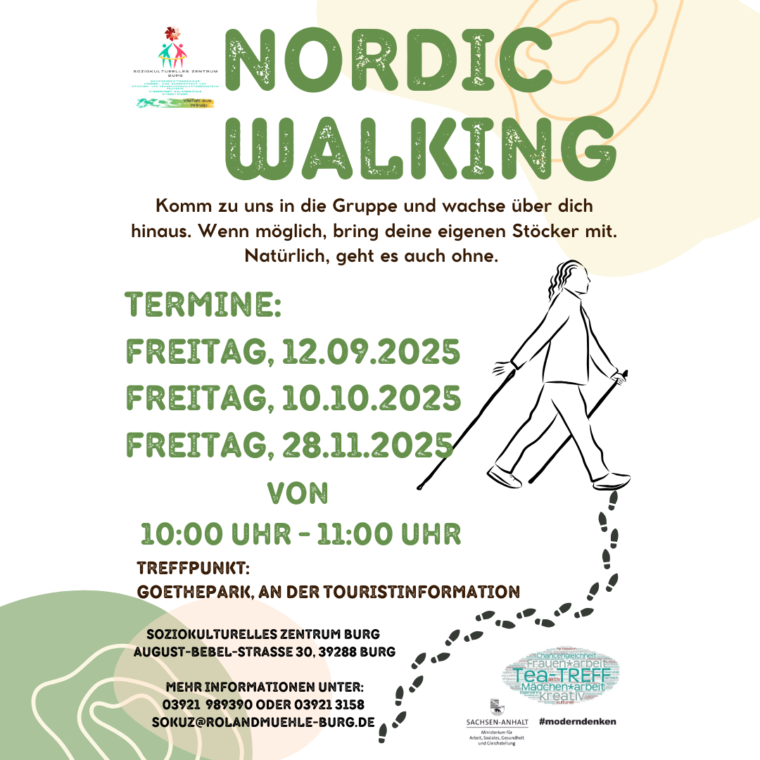 Goethepark Burg Bahnhofstraße 22, BurgNordic Walking - gemeinsam am Schönsten. Komm zu uns in die Gruppe und wachse über dich hinaus. Wenn möglich, bring deine eigenen Stöcker mit. Natürlich, geht es auch ohne. Treffpunkt: 39288 Burg, Goethepark, an der Touristinformation Veranstalterin: Mädchen- und Frauenkommunikationszentrum Burg Anmeldung erwünscht unter Tel: 03921 98 93 90 oder…